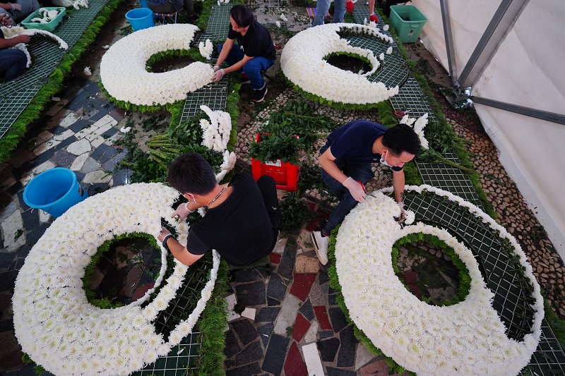 △花艺师们在花台基座旁忙碌,一座座洁白的菊花台已显露雏形。