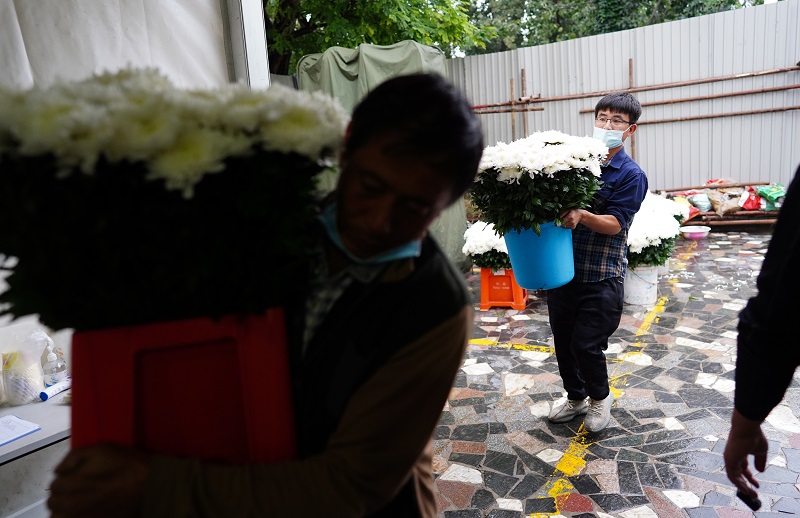 △用于庆典的白菊花自云南产地空运抵京,精挑细选后将被制成花台。