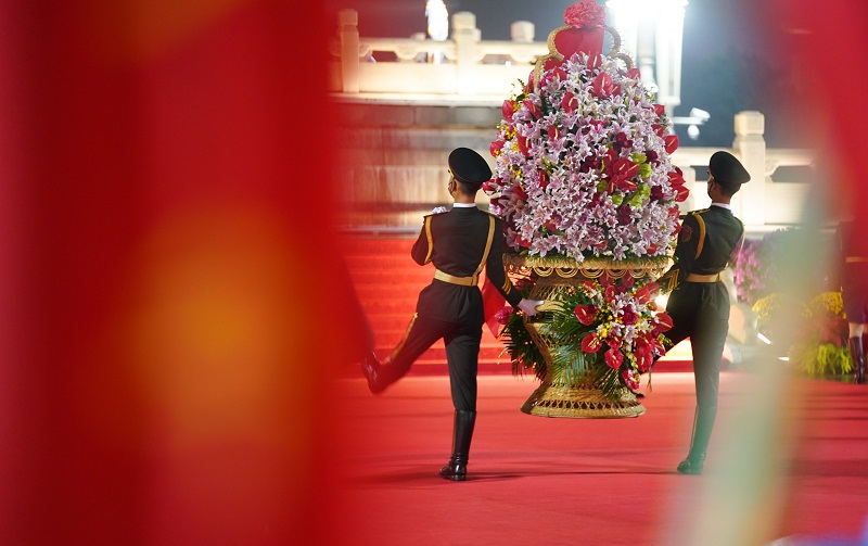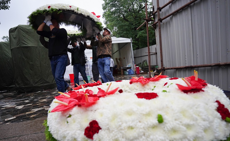 △烈士纪念日向人民英雄敬献花篮仪式演练现场,满含制作人员心血与敬意的花篮以完美形态呈现,步步留香,致敬英烈。