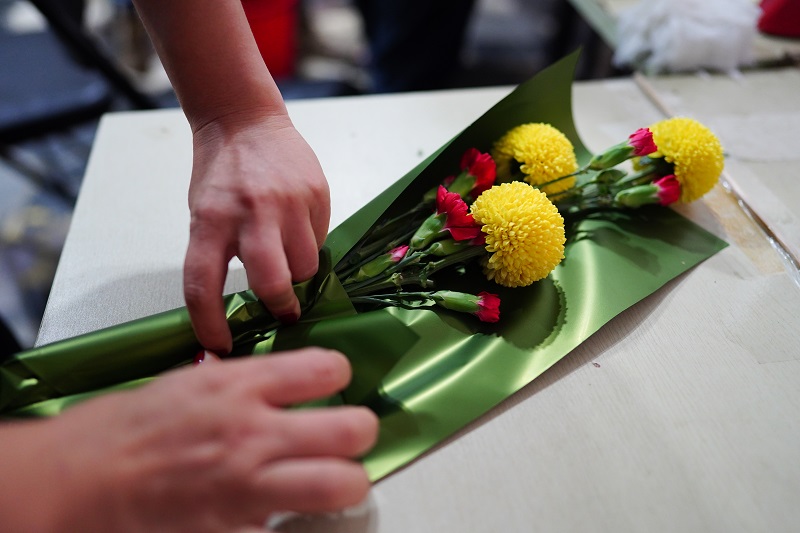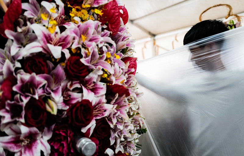 △花艺师为花篮覆盖薄膜保鲜,以保持鲜花的最佳状态。
