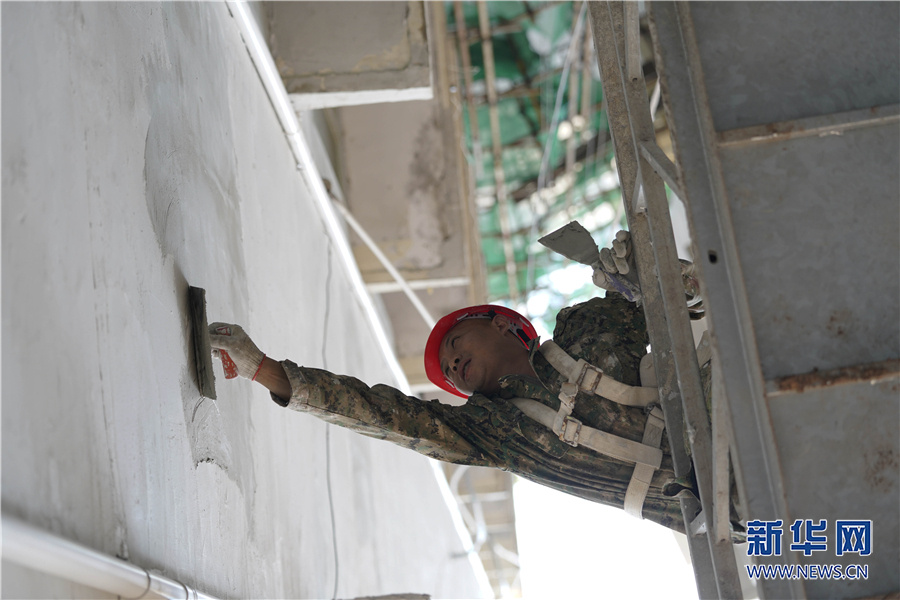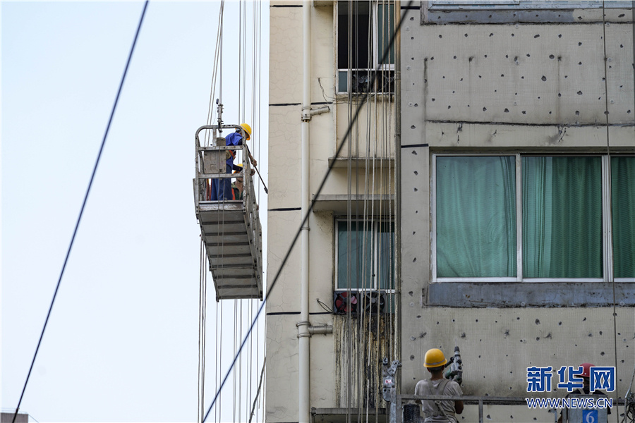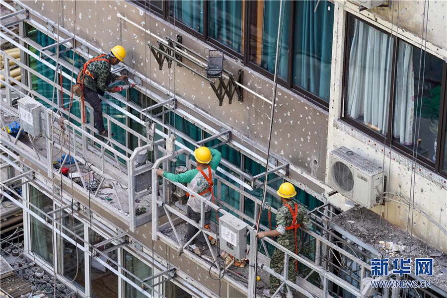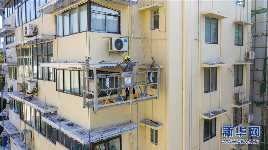10月2日,施工人员在重庆市北碚区新房子片区老旧小区改造项目施工现场忙碌。新华网发(秦廷富 摄)