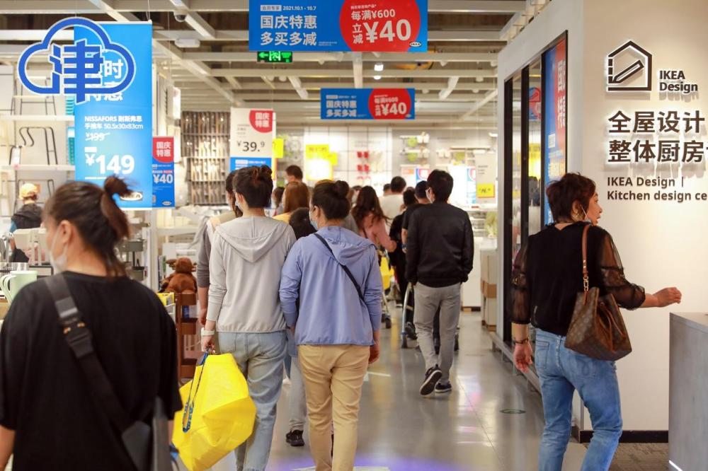 记者看到,服装区也已经完成了换季,帽衫、羽绒服等全部登场,李维斯、添柏岚等品牌还推出了超低折扣,吸引了很多市民选购。王祥兵告诉记者,由于外地疫情的原因,市民的出游意愿比较低,更多人选择了居家过节,今年国庆假期的整体销量比平日增长了50%,几乎赶上了春节的销售量。