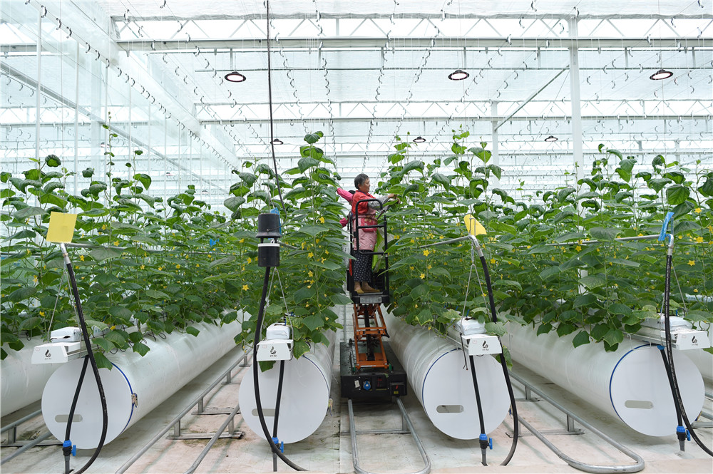9月16日,工作人员在浙江省嘉兴市一家农业数字化工厂的种植车间内乘轨道升降车对蔬菜进行日常管理。新华社记者 韩传号 摄