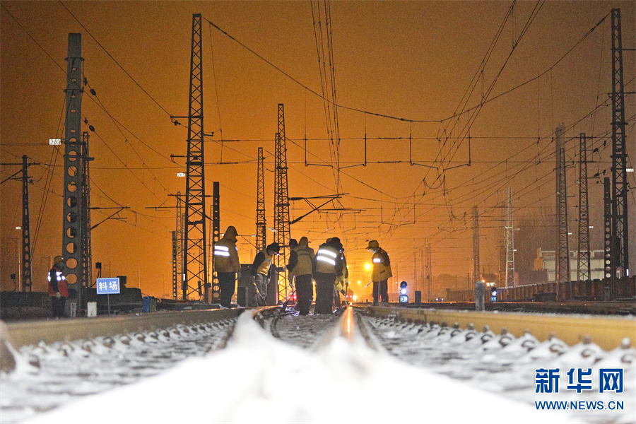 连日来,豫西南迎来较大降雪,焦柳、宁西线的轨道出现积雪。为确保春运线路安全畅通,中国铁路郑州局集团有限公司南阳工务段迅速启动应急预案。党员干部职工闻雪而动,利用临时天窗口,进行打冰除雪作业,确保管内线路设备无积雪、无结冰,确保铁路春运安全有序。新华网发(张中海 摄)