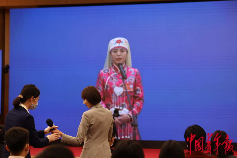 3月5日,北京梅地亚新闻中心,记者向全国人大代表、甘肃省临夏回族自治州积石山县吹麻滩小学校长董彩云提问。中青报·中青网记者 曲俊燕/摄