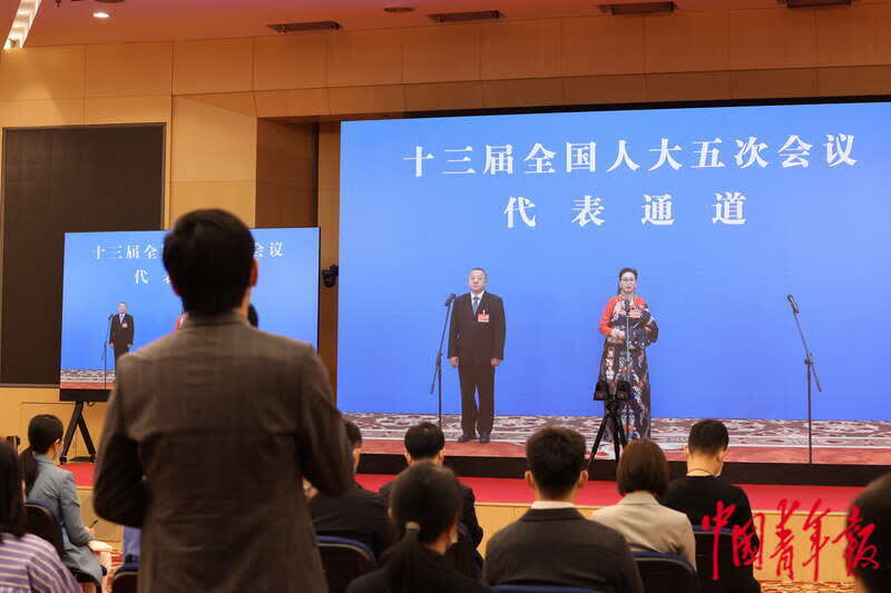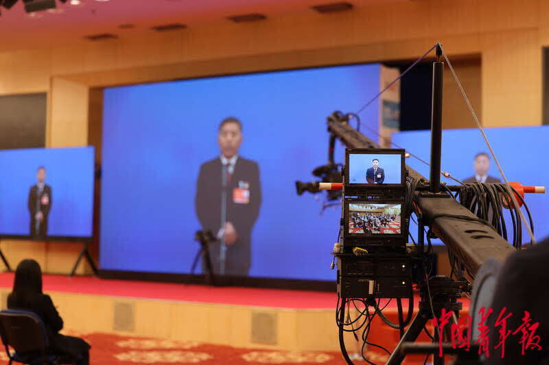 3月5日,北京梅地亚新闻中心,全国人大代表、贵州航天天马机电科技有限公司有色金属焊接班班长姜涛(左),全国人大代表、青海省黄南藏族自治州同仁市自来水公司职工夏吾卓玛通过网络视频方式接受采访。中青报·中青网记者 曲俊燕/摄
