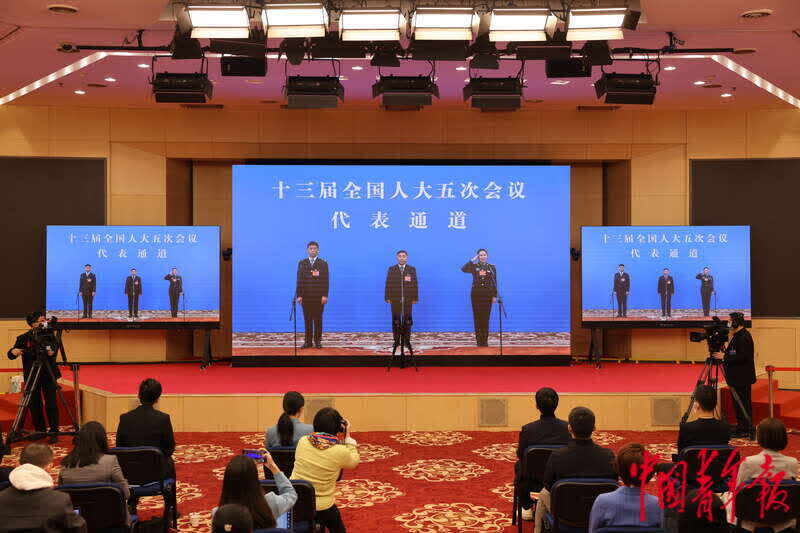 3月5日,北京梅地亚新闻中心,全国人大代表、中国邮政集团有限公司上海市邮区中心邮件接发员柴闪闪(左),全国人大代表、内蒙古自治区兴安盟森林草原防火站站长陈良(中),全国人大代表、中部战区联合作战指挥中心某保障队副队长王方(右),通过网络视频方式接受采访。当日,十三届全国人大五次会议在北京人民大会堂开幕。会前,举行首场“代表通道”采访活动,邀请部分全国人大代表通过网络视频方式接受采访。中青报·中青网记者 曲俊燕/摄