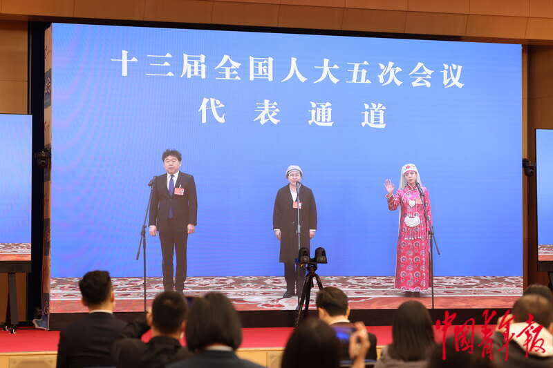3月5日,北京梅地亚新闻中心,全国人大代表、北京市建筑设计研究院、首钢集团总建筑师吴晨(左),全国人大代表、宁夏回族自治区吴忠市红寺堡区农民作家马慧娟(中),全国人大代表、甘肃省临夏回族自治州积石山县吹麻滩小学校长董彩云(右)通过网络视频方式接受采访。中青报·中青网记者 曲俊燕/摄