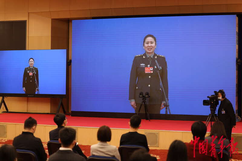 3月5日,北京梅地亚新闻中心,全国人大代表、中部战区联合作战指挥中心某保障队副队长王方,通过网络视频方式接受采访。王方说,在冬奥会的开幕式上,三军仪仗队战士闫振面对国旗流下热泪,倾注了对祖国深沉而炽热的爱,饱含对国家强大与民族复兴的骄傲与自豪。他们是无数平凡中国军人的缩影。然而正是在这些平凡人身上,蕴含着人民军队战无不胜的“精神密码”。中青报·中青网记者 曲俊燕/摄