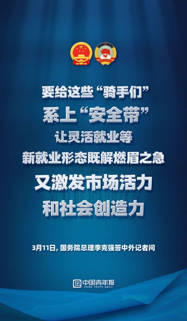 这里还不得不提到灵活就业,因为有2亿多人,形式多样、覆盖面广。作为一个发展中国家,这种就业形式会比较长期的存在。他们风里来、雨里去,确实很辛苦,很多地方在给他们提供暖心服务。作为政府,针对他们的劳动权益、社会保障等问题,我们要逐步完善政策,也就是说要给这些“骑手们”系上“安全带”,让灵活就业等新就业形态既解燃眉之急,又激发市场活力和社会创造力。