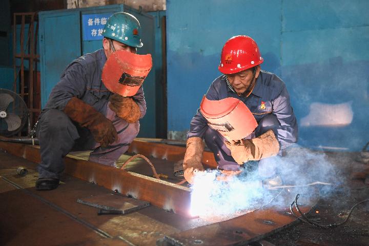2021年6月12日,艾爱国(右)在公司厂房内焊接。(新华社记者薛宇舸摄)