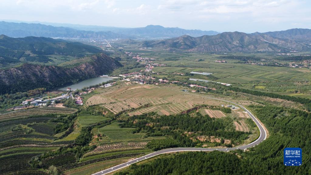 这是2021年8月30日拍摄的内蒙古赤峰市喀喇沁旗马鞍山村风光(无人机照片)。新华社记者 贝赫 摄