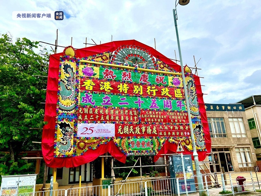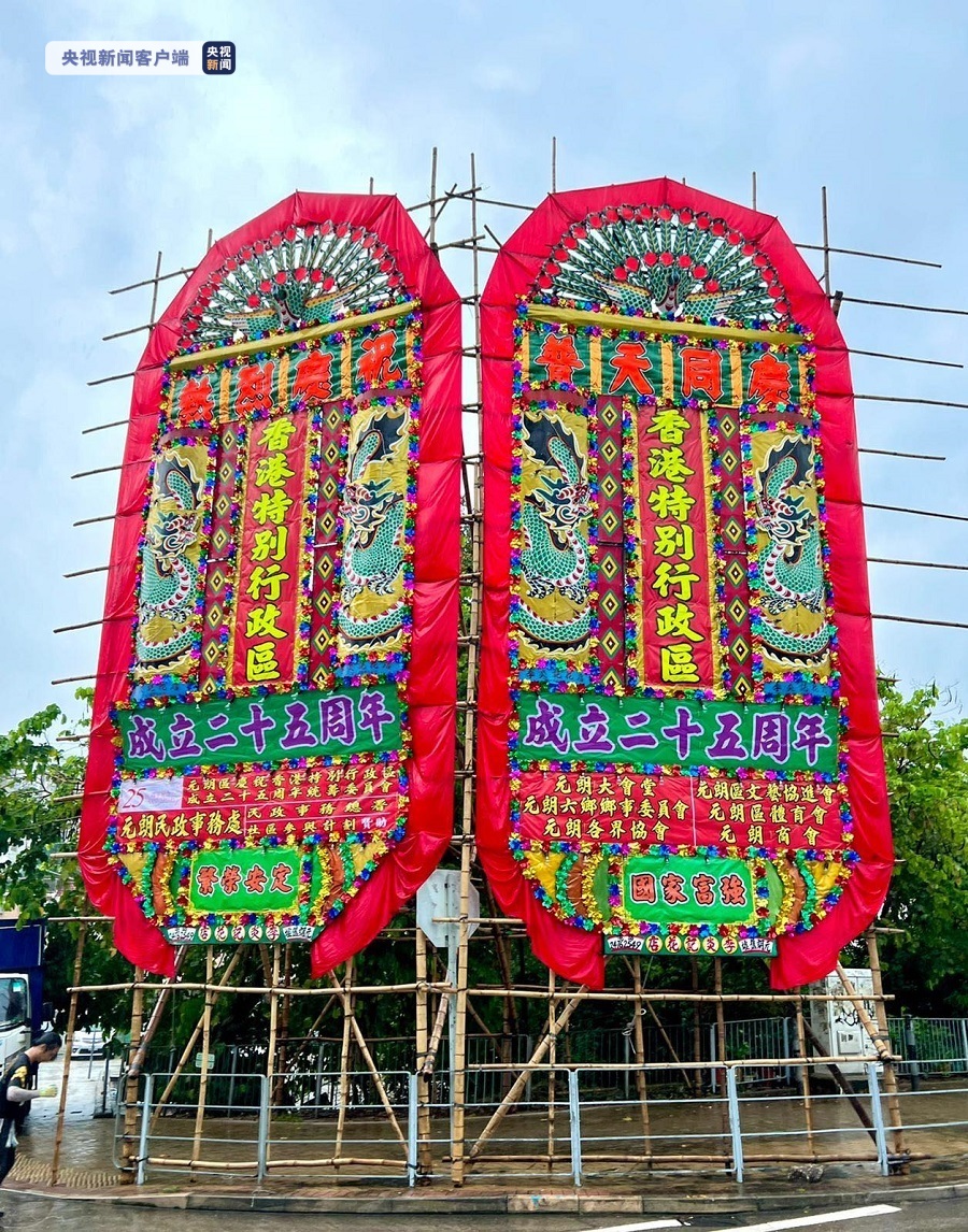 为庆贺香港回归祖国25周年,香港新界居民纷纷在大埔、元朗、上水等多处自发架设传统大型花牌阵,共庆共乐,传达的祝福同时,也促进香港传统手艺传承和文化保育。