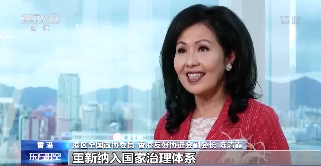 港区全国政协委员 香港友好协进会副会长 陈清霞:香港从回归之日起,重新纳入国家治理体系 ,走过25年不寻常的历程。“一国两制”在香港的实践,取得举世公认的成功。