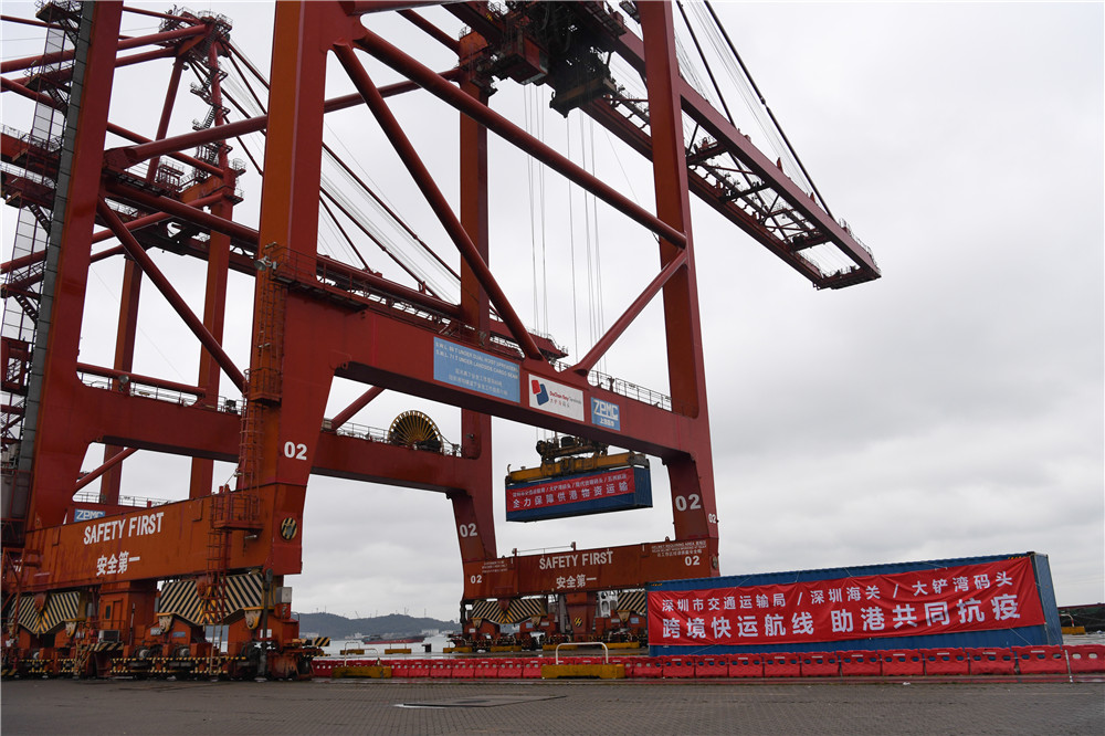 在深圳大铲湾码头,满载供港蔬菜、水果、鸡蛋的集装箱吊装上船(2022年2月21日摄)。新华社记者 梁旭 摄