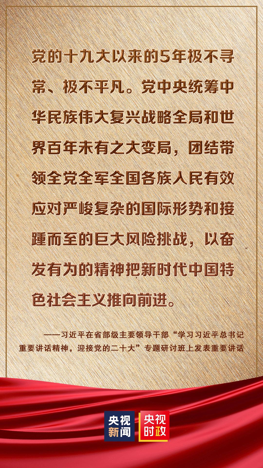 省部级主要领导干部“学习习近平总书记重要讲话精神,迎接党的二十大”专题研讨班26日至27日在京举行。中共中央总书记、国家主席、中央军委主席习近平发表重要讲话强调,在全面建设社会主义现代化国家、向第二个百年奋斗目标进军的新征程上,全党必须高举中国特色社会主义伟大旗帜,坚持以马克思主义中国化时代化最新成果为指导,坚定中国特色社会主义道路自信、理论自信、制度自信、文化自信,坚定不移推进中华民族伟大复兴历史进程。我们要牢牢把握新时代新征程党的中心任务,提出新的思路、新的战略、新的举措,继续统筹推进“五位一体”总体布局、协调推进“四个全面”战略布局,踔厉奋发、勇毅前行、团结奋斗,奋力谱写全面建设社会主义现代化国家崭新篇章。