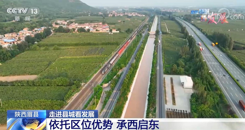 从空中俯瞰眉县,四通八达的交通区位优势十分明显。眉县位于西安和宝鸡之间,多条交通干线穿境而过。眉县坚持走“承西启东”的发展之路,“承西”精准对接宝鸡工业产业,“启东”加速拉近眉县与西安的空间距离,积极融入西安半小时经济圈。