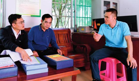在海南省琼中黎族苗族自治县湾岭镇加章村委会,纪检监察干部(左一)在查阅乡村振兴及村级财务支出相关材料(2021 年 11 月13 日摄) 杨冠宇摄 / 本刊