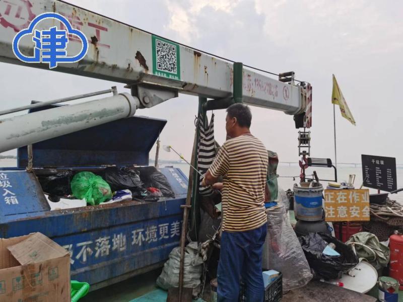 夫妻俩的工作范围覆盖整片荆州港,途中每一艘停泊的船只,他们都要靠近询问,有无需要转运的垃圾。得到船员的应允后,陈景旭会慢慢行驶船只靠近目标,再将缆绳套在两船之间。待准备工作就绪,他穿好救生衣,踩着清运船顶爬到另一艘船上,把需要转运的垃圾递给等待的妻子。