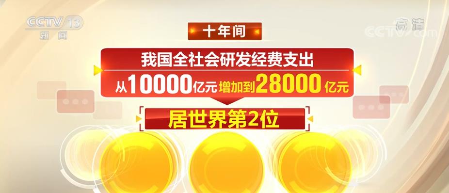 十年间,我国全社会研发经费支出从10000亿元增加到28000亿元,居世界第2位,研发人员总量居世界首位,我国已进入创新型国家行列。