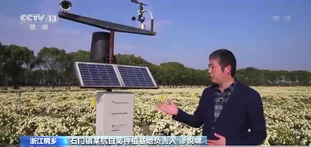 浙江桐乡石门镇某杭白菊种植基地负责人 谬悦啸:这是一台无线农业气象综合监测站,它就像我们的眼睛,以前我们都是走到土地里面查看我们的一个种植情况,现在它能够给我们检测到光照、土壤、水分等信息,传送到大数据平台,来帮助我们预测气象所带来的一个病虫害等问题,为我们杭白菊提质增效、保驾护航。