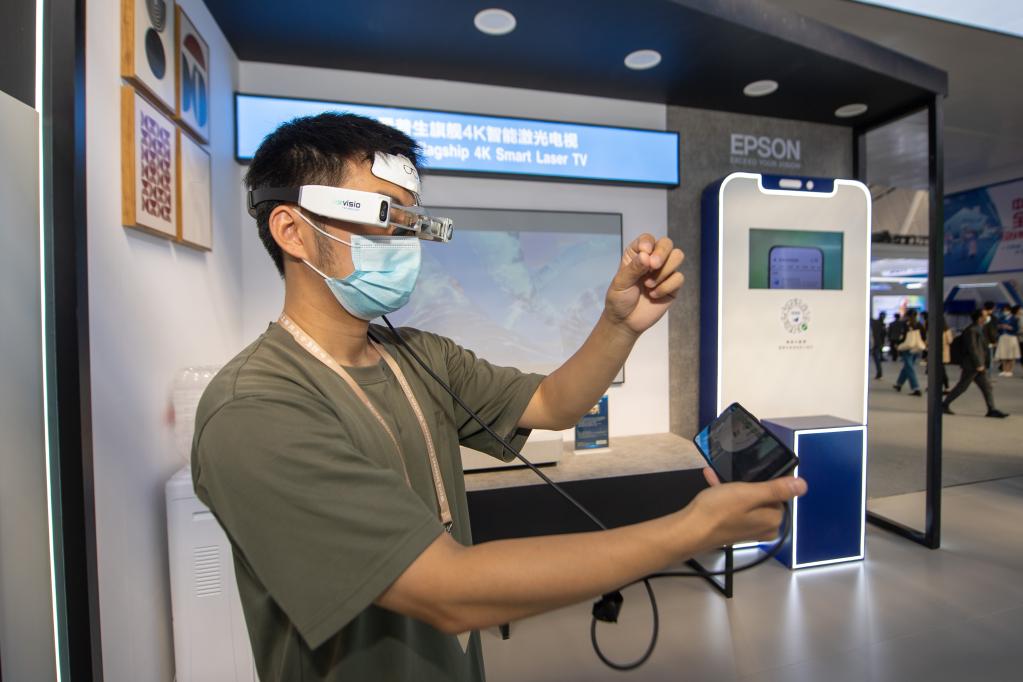 11月10日,观众在爱普生公司展台体验AR感知交互眼镜系统。新华社记者 江汉 摄