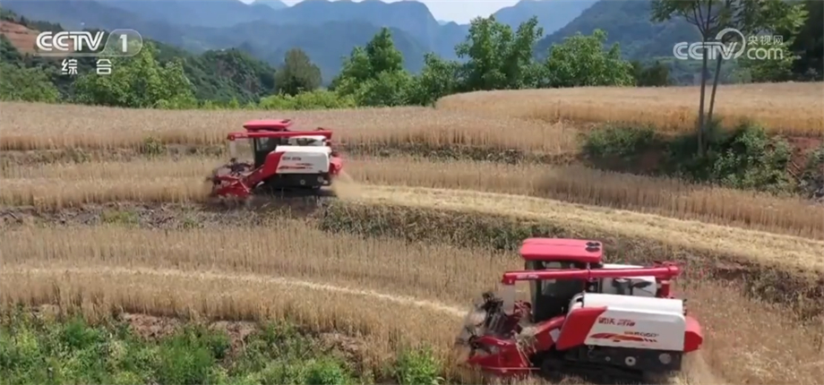 此外,还有更多适应性能强的农机装备开进了以往机收率不高的地块。在甘肃省徽县,15万亩小麦已陆续成熟。徽县地处秦巴山,耕地大多以坡地为主。为了让小麦颗粒归仓,当地组织体型小、能爬坡过坎的履带式联合收割机开展机收作业,机收率达到95%以上,打通了农机进田“最后一公里”的难题。