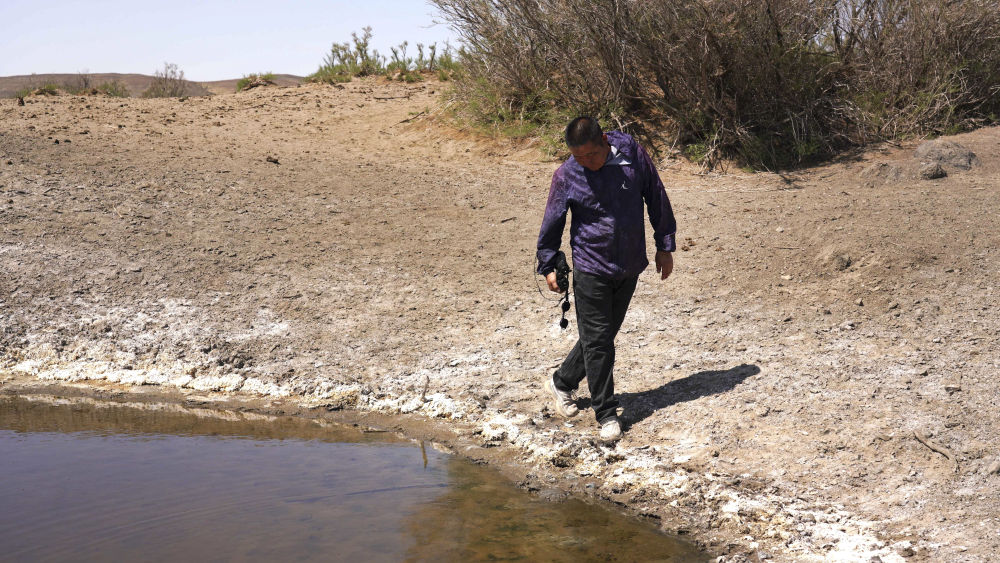 工作人员在野生动物水源地查看水质(5月16日摄)。新华社记者 张啸诚 摄