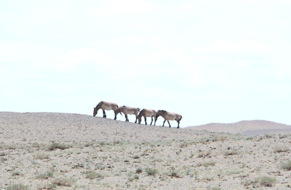 盛夏,新疆准噶尔盆地东部,荒漠低丘间,普氏野马悠闲踱步。