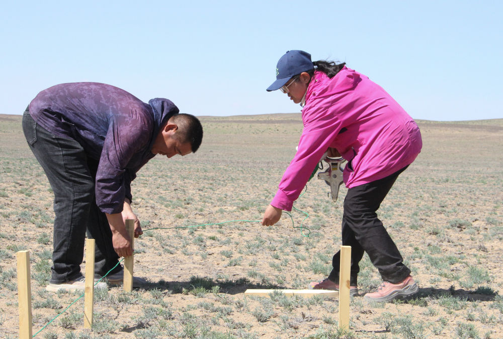 巡护员阿达比亚特(左)与同事在卡拉麦里保护区设置检测点(5月16日摄)。新华社记者 刘红霞 摄