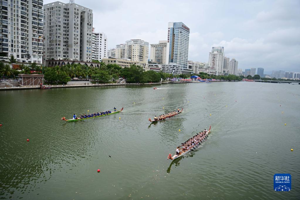 6月18日,龙舟队在海南省三亚市三亚河上进行比赛。