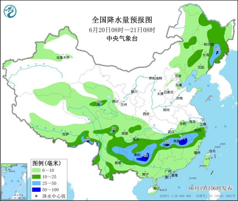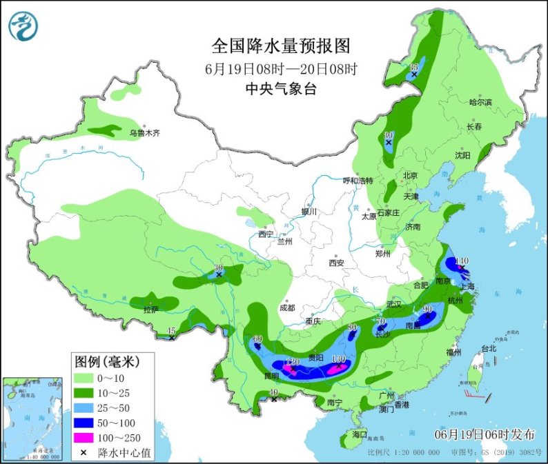 预计,19日白天到夜间,江苏东南部、上海、江西北部、湖南中部、贵州南部、云南东部、广西北部等地部分地区有大到暴雨,江苏东南部、贵州西南部、云南东部、广西北部等局地有大暴雨(100~140毫米)。建议上述地区公众密切关注当地气象部门发布的气象信息,加强防范城市内涝、局地山洪和地质灾害等,出行尽量避开强降雨时段,远离灾害易发区。
