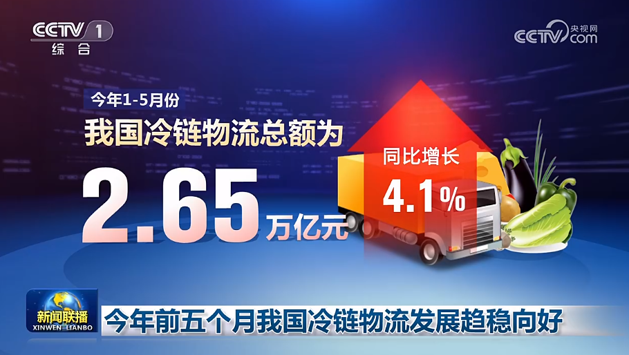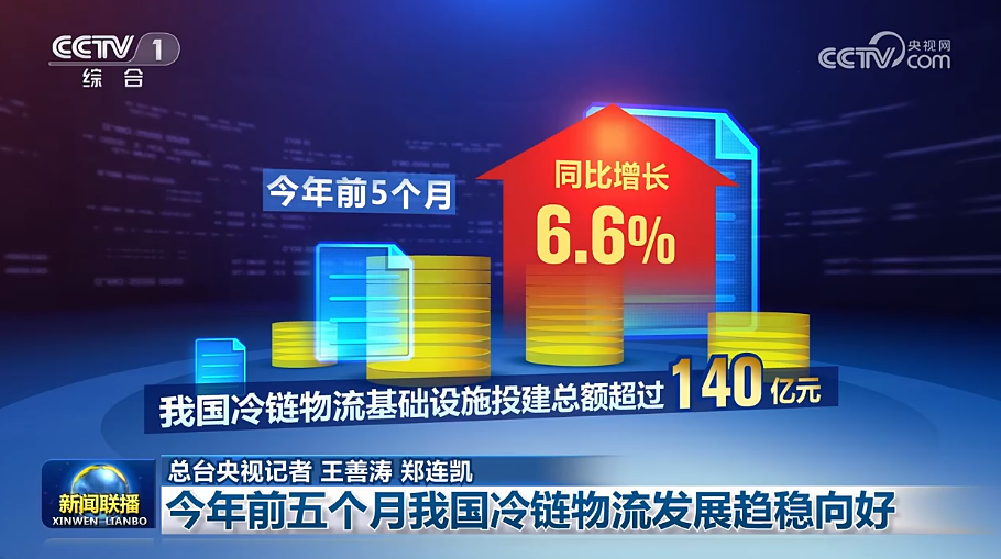 央视网消息(新闻联播):中国物流与采购联合会最新统计数据显示,今年1—5月份,随着消费回暖,我国冷链物流发展趋稳向好,冷链基建投资稳定增长。
