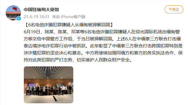 据@中国驻缅甸大使馆 微博消息,6月19日,陆某、陈某、邓某等6名电信诈骗犯罪嫌疑人在仰光国际机场由缅甸警方移交给中国警方工作组,于当日被押解回国。上述6人在中缅泰三方联合打击缅泰边境涉电诈犯罪行动中被抓获。此举彰显了中缅泰三方联合打击跨国犯罪特别是涉诈赌犯罪的坚定决心和意志。中方将继续加强同缅方和泰方的务实执法合作,保持对此类犯罪的严打态势,切实维护人民群众财产安全。