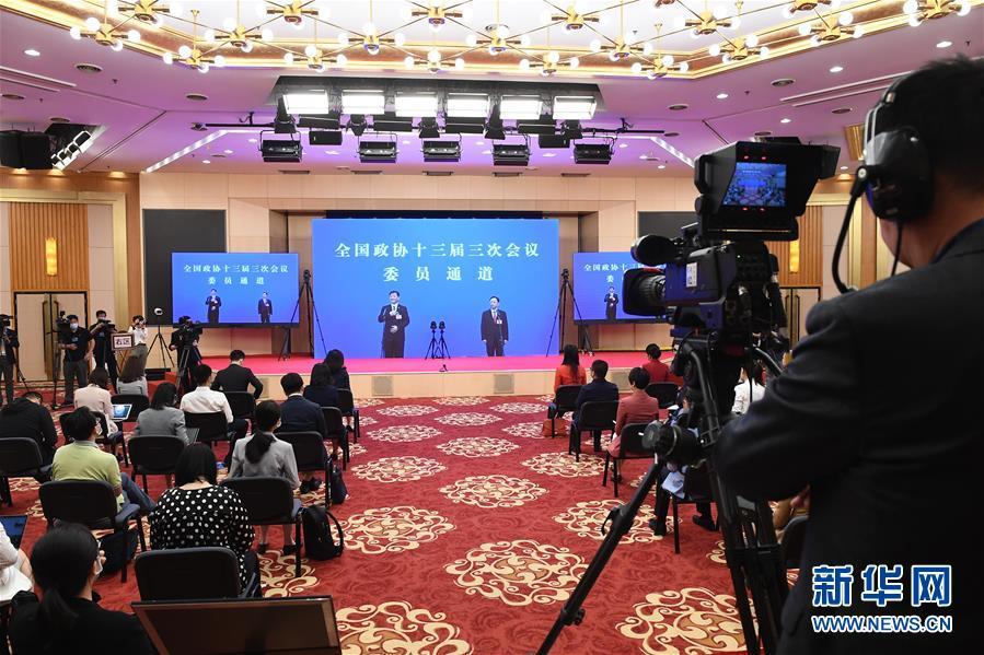 5月24日,在北京人民大会堂新闻发布厅举行全国政协十三届三次会议第二场“委员通道”采访活动。这是全国政协委员通过网络视频方式接受媒体采访。 新华社记者 刘金海 摄
