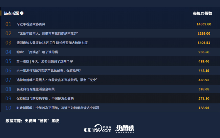 据央视网“智闻”系统“央视网指数”热度显示,23日下午,总书记参加经济界委员联组会的新闻迅速高居榜首。
