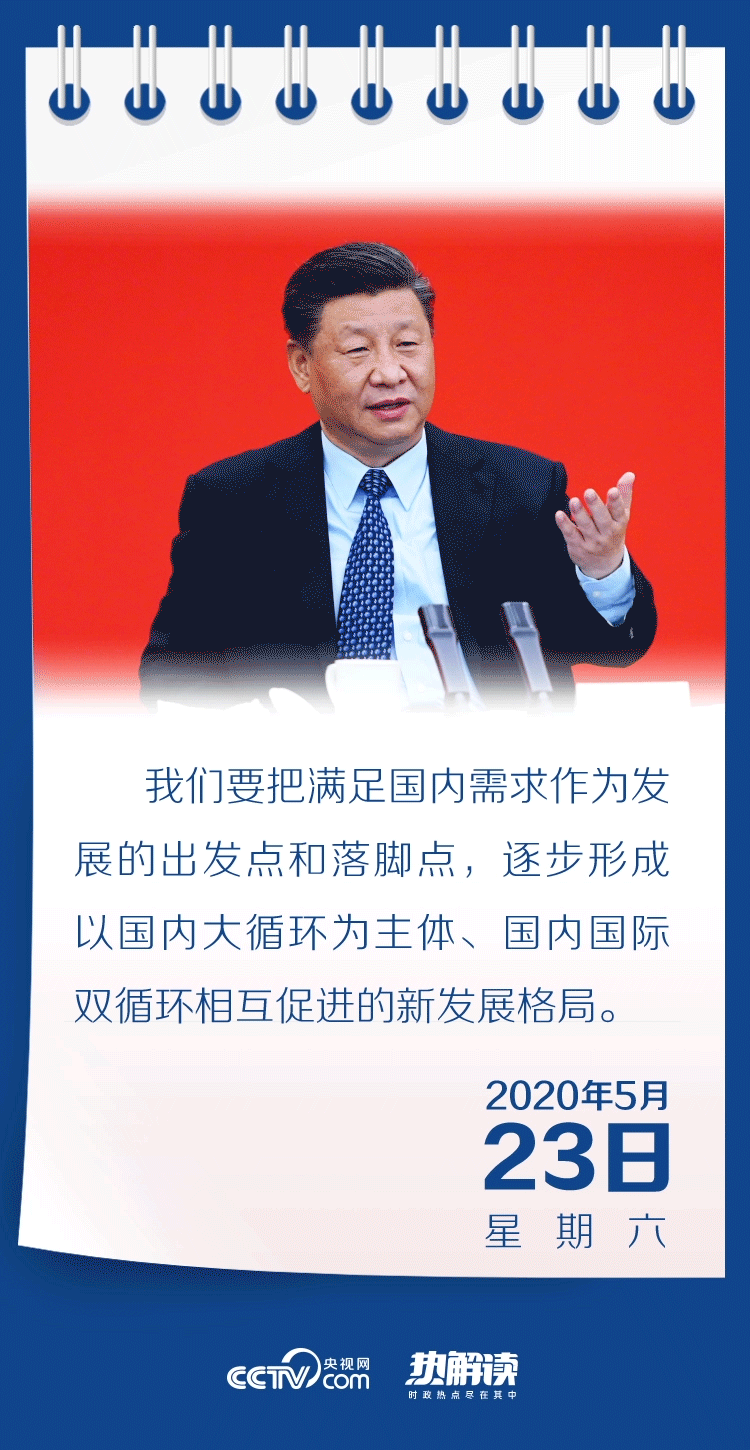 2020年5月23日,习近平总书记参加全国政协十三届三次会议经济界委员的联组会。会上,总书记分析世界经济发展情况,指明我国经济发展的巨大潜力,着眼满足国内需求,提出以国内大循环为主体、国内国际双循环相互促进的新发展格局。