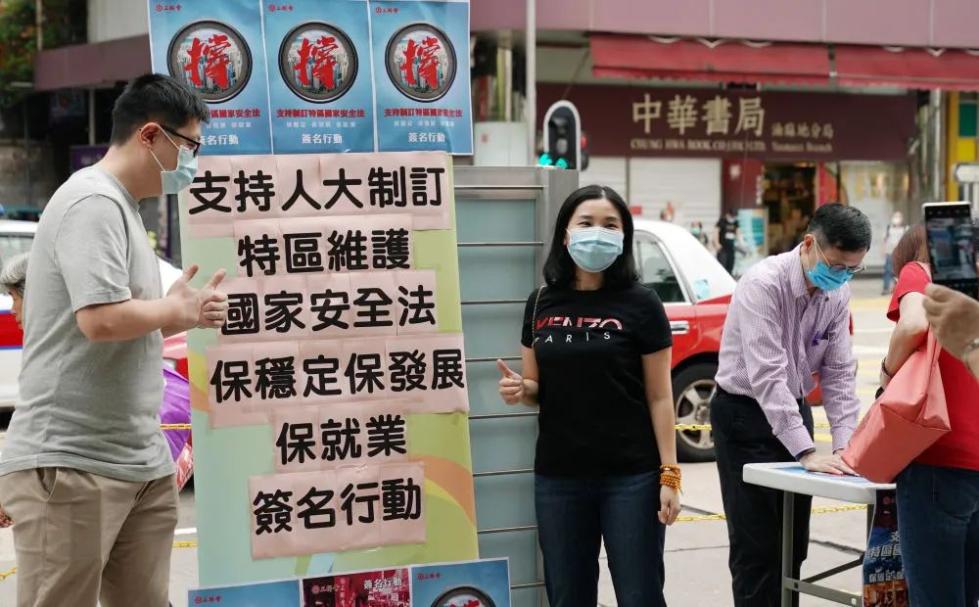 5月23日,香港市民在街头签名,支持国家安全立法。(新华社记者李钢摄)