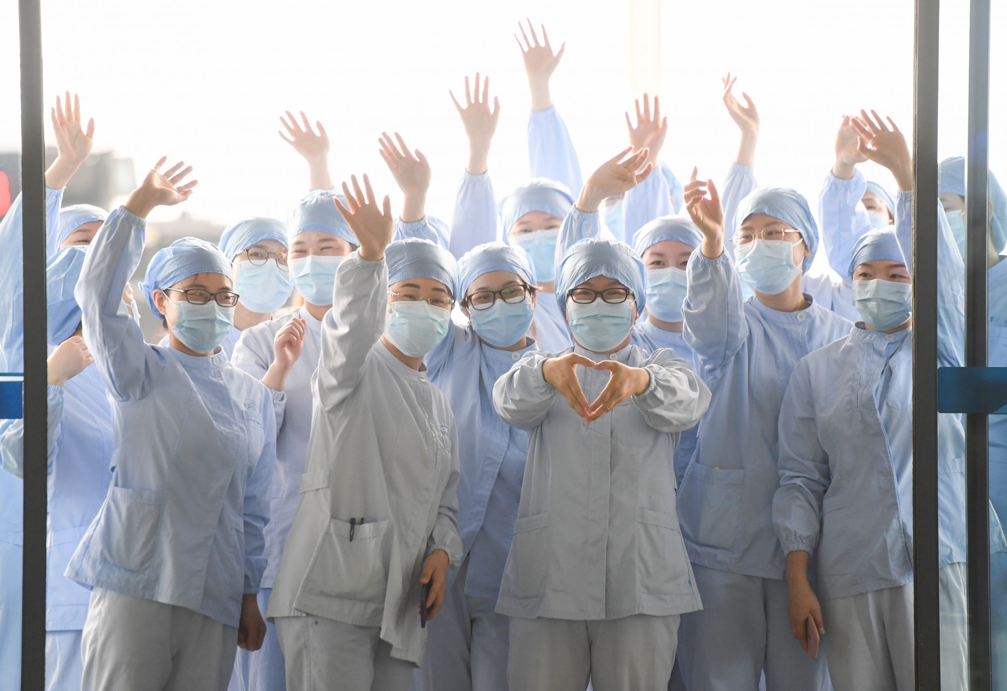 武汉市第一医院的医护人员在武汉天河机场为广东第14批援鄂医疗队送行(2020年3月23日摄)。新华社记者 陈晔华 摄