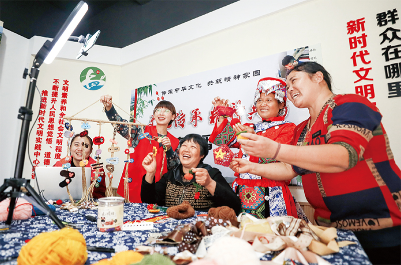2021年10月27日,浙江省湖州市长兴县虹星桥镇毕家村在新时代文明实践站开展“文化传承,精神共富”直播带货活动。该村以“党建+”的形式,带领村民一起制作手工艺品,学习电商、直播等线上营销网络新技能,提升村民就业技能,助力共同富裕。图为青年党员志愿者和村民一起直播带货。 求是图片 陆一平/摄