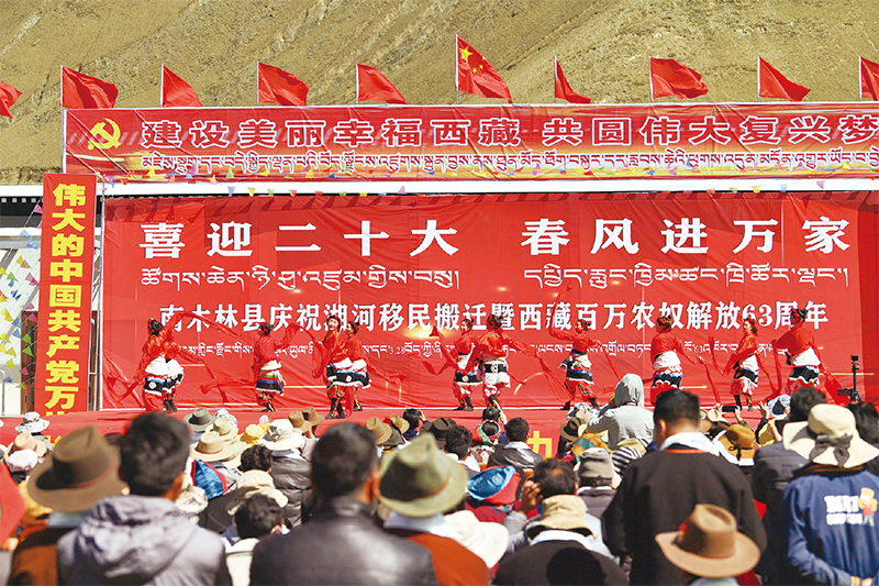 2021年7月,在西藏考察时,习近平总书记强调“学史力行”。图为2022年3月28日,在日喀则市南木林县卡孜乡湘河水库移民新村广场,当地艺术团在庆祝搬迁暨西藏百万农奴解放63周年活动上表演节目。 新华社记者 张汝锋/摄