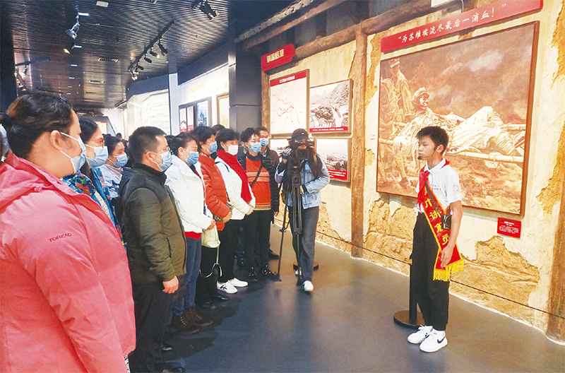 2021年4月,在广西考察时,习近平总书记强调“学史增信”。图为桂林市全州县“红领巾”讲解员在油画《陈树湘》前进行讲解。 广西壮族自治区党委宣传部供图 邓琳/摄