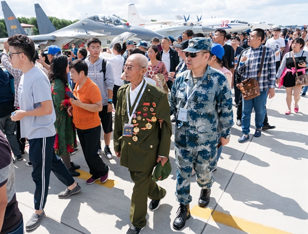 2018年空军航空开放活动上,老兵参观战斗机装备静态展示。摄影:万全