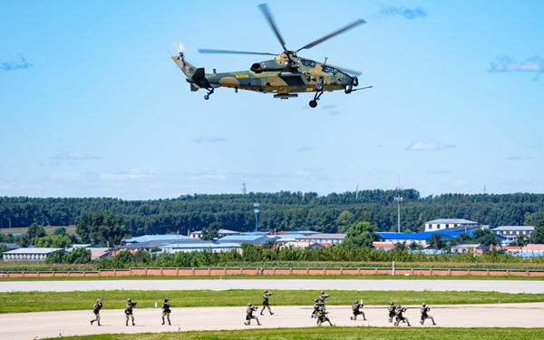 2022年空军航空开放活动中,空降兵某空中突击旅进行空中突击分队反恐营救行动演示。武直-10K武装直升机对机降至地面的我特战队员进行火力支援。摄影:万全