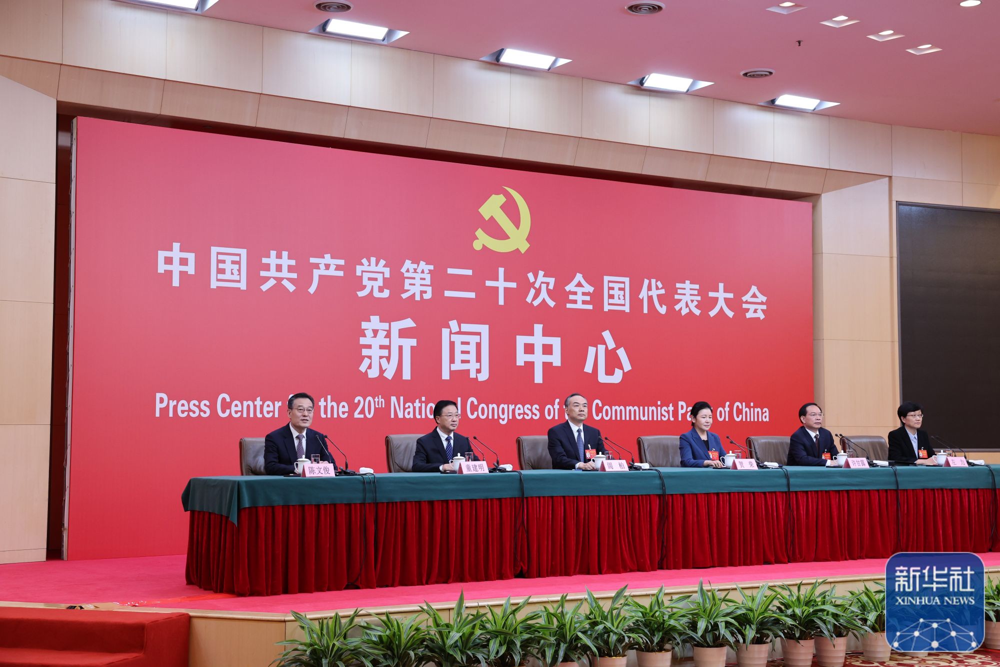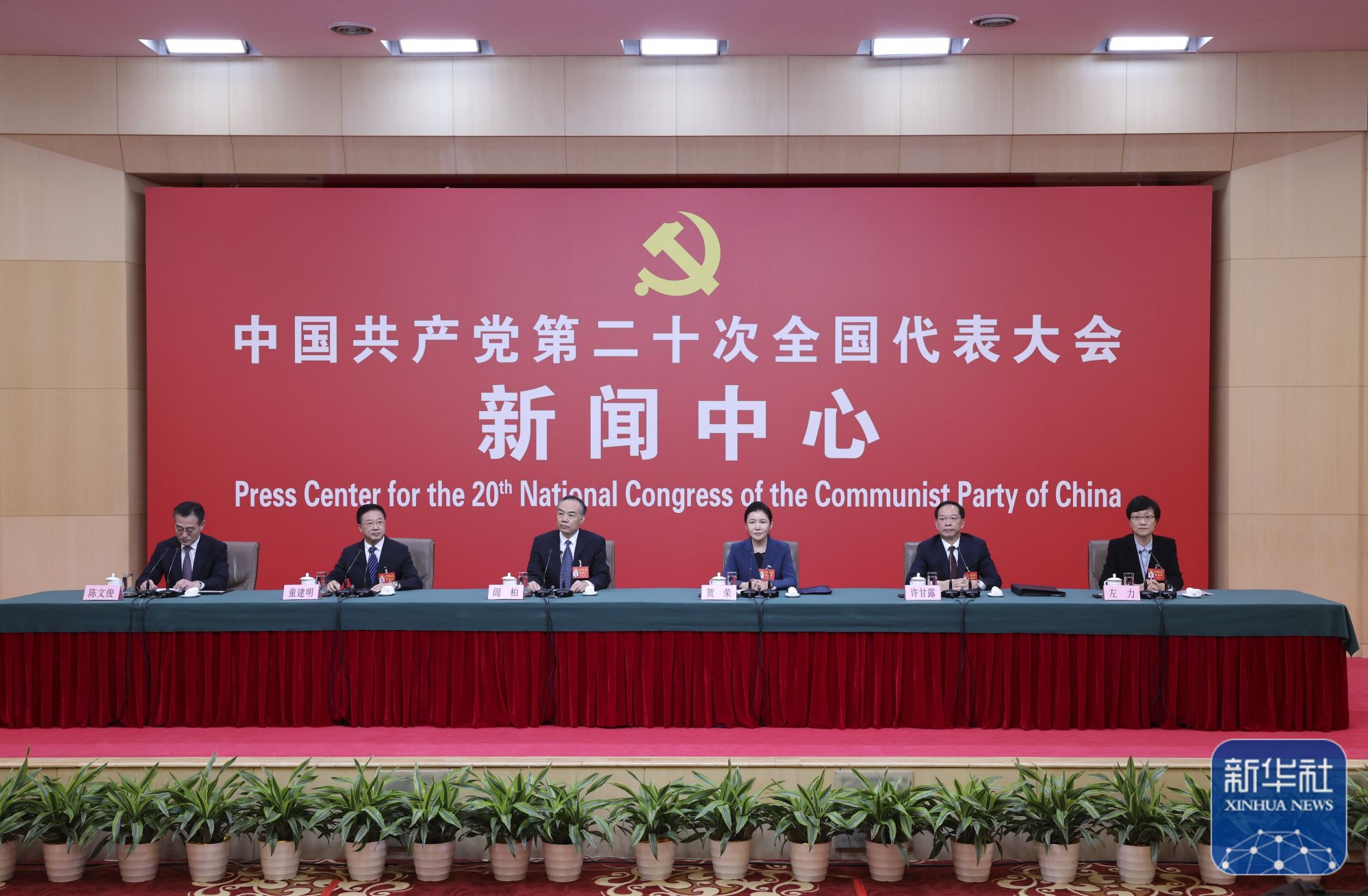 10月19日,中国共产党第二十次全国代表大会新闻中心举行记者招待会。中央政法委副秘书长訚柏,最高人民法院党组副书记、分管日常工作的副院长、一级大法官贺荣,最高人民检察院党组副书记、分管日常工作的副检察长、一级大检察官童建明,公安部党委委员、副部长、国家移民管理局党组书记、局长许甘露,司法部党组成员、副部长左力围绕“坚持以习近平法治思想为指引 努力建设更高水平的法治中国”主题与记者交流。新华社记者 张玉薇 摄