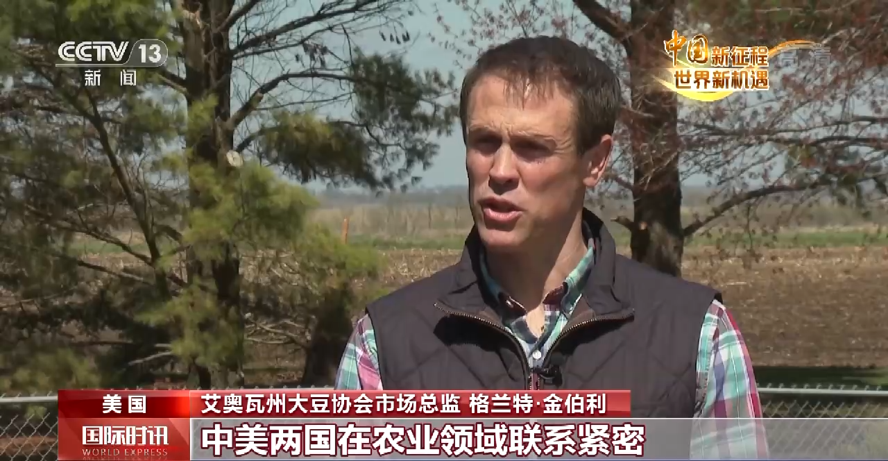 艾奥瓦州大豆协会市场总监 格兰特·金伯利:中美两国在农业领域联系紧密,特别是艾奥瓦州与中国在农业上的联系,以及不断开展的人文交流。我认为双方有着深厚的友谊基础。所以我想说,习主席,我们欢迎您再来艾奥瓦州,再来我们的金伯利农场。