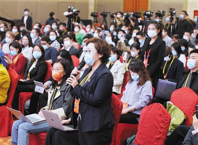 10月20日,二十大新闻中心举行第五场集体采访。图为新京报记者陈琳在分会场提问。