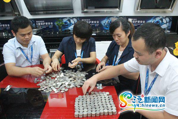 10月31日上午,三亚市明珠广场迎来一对老夫妇消费者,他们抱着沉甸甸的箱子到明珠广场购买冰箱。老夫妇在选择了一款冰箱并付款时,着实让商场的柜台服务员惊呆了,原来老人抱的箱子里面装着整整1500个1元的硬币。
