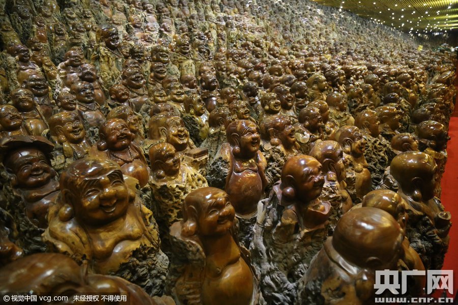 2015年11月23日,河南省郑州市,在某企业的一座万佛苑内,存放着9000多座用枣树雕刻而成的佛像,造型迥异,风格各不相同,场面十分震撼。