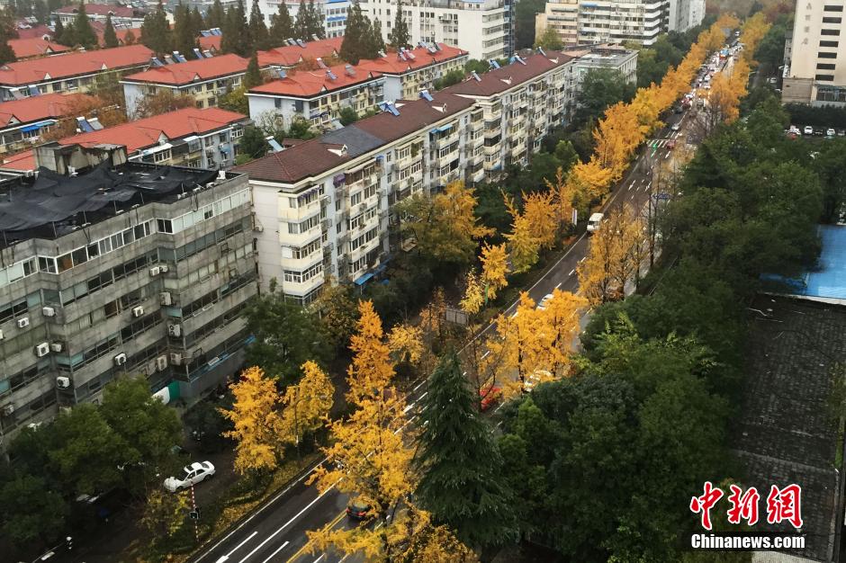 11月24日,车辆在“金灿灿”的银杏树中间道路上经过。当日,南京迎来降温降雨,一片片金黄的树叶把道路妆扮的如同“金色大道”,在雨中显的格外的亮眼。中新社记者 泱波 摄